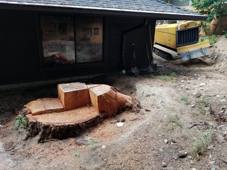 This ancient stump at an Issaquah, WA home was hindering progress for our clients. It was a tripping hazard for anyone entering or exiting their home and workshop.